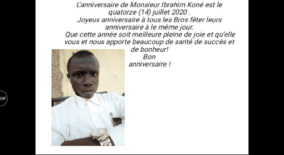 Monsieur Ibrahim Koné a le plaisir de vous informer que son anniversaire est le quatorze (14) juillet 2020